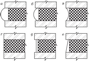 Рис. 32. Формы расшивки: а) выпуклая, б) выпуклая втопленная, в) вогнутая, г) в подрезку, д) заглубленная, е) односрезная
