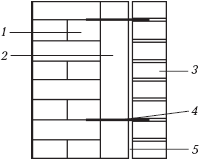 Рис. 33. Устройство слоистой кладки: 1 – несущая стена, 2 – теплоизоляция, 3 – облицовочный слой, 4 – закладные детали (связи), 5 – воздушный зазор