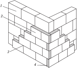 Рис. 35. Схема укладки утеплителя: 1 – несущая стена; 2 – теплоизоляционные плиты; 3 – Т-образные стыки плит при укладке вразбежку; 4 – зубчатое зацепление плит в углах здания