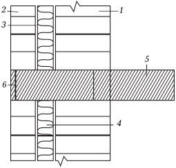 Рис. 36. Устройство несущих поясов в защитно-декоративной стенке: 1 – внутренняя часть стены; 2 – наружная защитно-декоративная кладка толщиной 120 мм; 3 – воздушный зазор; 4 – теплоизоляционные плиты; 5 – несущая балка-пояс; 6 – мастика
