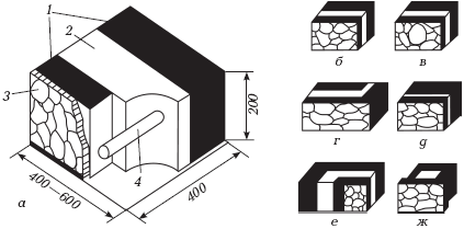 Рис. 37. Многослойные теплоэффективные блоки: а) устройство блока; 1 – керамзитобетон; 2 – пенополистирол; 3 – защитно-декоративный слой; 4 – связующая арматура; б) блок рядовой; в) блок рядовой с устройством воздухообмена; г) блок угловой наружный; д) блок с четвертью для проемов; е) блок угловой внутренний; ж) блок проемов двухсторонний
