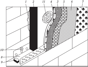 Рис. 38. Система внешней теплоизоляции «мокрый фасад»: 1 – клеящий раствор; 2 – теплоизоляционная плита; 3 – армированный раствор; 4 – сетка из стекловолокна; 5 – грунтовка; 6 – минеральная штукатурка; 7 – фасадная краска; 8 – цокольная планка; 9 – соединительный элемент цокольной планки; 10 – крепления цокольной планки; 11 – тарельчатый дюбель