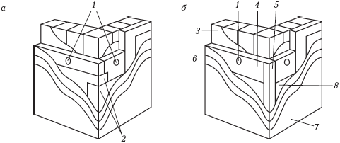 Рис. 40. Отделка наружных углов стен: а) с использованием только армирующей сетки; б) с использованием армирующей сетки и углового профиля; 1 – дюбели; 2 – полотна армирующей сетки с нахлестом; 3 – клей для крепления утеплителя; 4 – утеплитель; 5 – угловой профиль; 6 – раствор для выполнения армирующего слоя; 7 – армирующая сетка; 8 – штукатурка