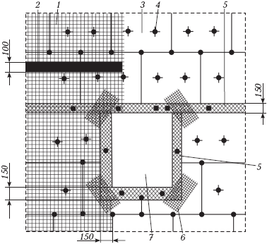 Рис. 43. Усиление углов проемов (стрелка вверху указывает направление укладки сетки): 1 – армирующая сетка; 2 – перехлест стеклосетки; 3 – плита ЭППС; 4 – тарельчатый дюбель для крепления плит; 5 – противопожарная рассечка из минераловатных плит; 6 – усиливающий элемент из армирующей сетки; 7 – оконный или дверной проем
