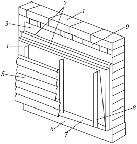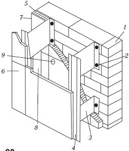 Рис. 45. Конструкция навесного вентилируемого фасада на металлическом каркасе: 1 – утепляемая стена; 2 – распорный анкер; 3 – кронштейн; 4 – направляющие; 5 – теплоизоляционные плиты; 6 – плиты защитной декоративной облицовки; 7 – воздушный зазор; 8 – вставка кронштейна; 9 – фасадный дюбель