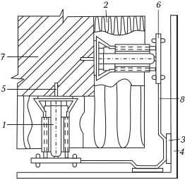 Рис. 46. Схема крепления облицовки и плит утепления в зоне наружного угла здания: 1 – кронштейн; 2 – теплоизоляционные плиты; 3 – кляммер; 4 – плитка облицовочная; 5 – утепляемая стена; 6 – заклепка; 7 – анкерный дюбель; 8 – гнутый уголковый профиль