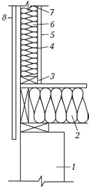 Рис. 50. Изоляция каркасной стены: 1 – фундамент; 2 – утеплитель, уложенный в каркас пола; 3 – герметичный стык пароизоляции стены и пола; 4 – пароизоляция; 5 – внутренняя отделка; 6 – теплоизоляция стены в полостях каркаса; 7 – ветро– и гидроизоляция; 8 – наружная обшивка
