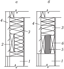 Рис. 51. Изоляция концевых балок: а) одинарных; б) двойных; 1 – стойка; 2 – одинарная концевая балка 50 × 150 мм; 3 – теплоизоляционный мат; 4 – обшивка; 5 – жесткая изоляция; 6 – сдвоенная концевая балка из досок 50 × 150 мм