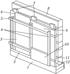Рис. 52. Укладка паро– и теплоизоляции: 1 – стена фундамента; 2 – гидроизоляция; 3 – пароизоляция; 4 – вертикальные планки каркаса для второго слоя утеплителя; 5 – горизонтальные планки каркаса для первого слоя утеплителя; 6 – самоклеящаяся лента, герметизирующая крепежные отверстия в пароизоляции; 7 – каркас из досок; 8 – бревенчатая стена; 9 – первый слой теплоизоляции; 10 – второй слой теплоизоляции; 11 – вентиляционный зазор; 12 – вентиляционное отверстие