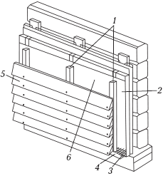 Рис. 53. Укладка ветроизоляции и финишной обшивки: 1 – каркас для обшивки; 2 – ветроизоляционный слой; 3 – металлическая защитная сетка; 4 – дополнительная планка, применяемая при обшивке досками внахлест; 5 – обшивка; 6 – самоклеящаяся лента, герметизирующая место стыка полос ветроизоляции