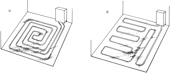 Рис. 55. Укладка труб: а) по спирали; б) змейкой