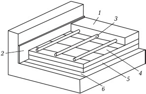 Рис. 56. Устройство водяного теплого пола: 1 – бетонная стяжка (30 мм над трубой); 2 – демпферная лента; 3 – труба PE-RT; 4 – арматурная сетка; 5 – полистирольная плита плотностью не менее 35 мг/м3, толщиной 30 – 200 мм; 6 – полиэтиленовая пленка 100 мкм