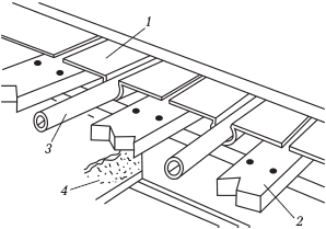 Рис. 57. Реечный тип монтажа водяного теплого пола: 1 – теплоотражающая пластина; 2 – лаги; 3 – труба отопления; 4 – теплоизоляция