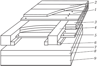 Рис. 58. Схема утепления перекрытий первого этажа по деревянным балкам: 1 – черновой пол; 2 – чистовой пол; 3 – утеплитель; 4 – лаги пола; 5 – накат из досок; 6 – черепной брусок; 7 – воздушный зазор; 8 – песчаная засыпка; 9 – уплотненный щебнем грунт