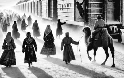 А вот сотни выстроившихся в колонну немок, наоборот, с открытым интересом буквально до мелочей рассматривали толпу собравшихся на них поглазеть казахов. Инородный внешний вид встречающих пугал и забавлял одновременно. Прибывшим могло показаться, что их полукругом огораживает сплошная стена из меховых больших шапок на головах стариков и подростков, женских высоких головных уборов, наподобие накрученных в форме бидона многометровой белой ткани и конусообразных с перьями на макушках колпаков у девушек. Темные, широкие, как будто приплюснутые лица с непривычно узким разрезом глаз были европейкам в диковинку. Уроженцы казахстанской степи, одетые в разношерстные овечьи тулупы, большинство восседающих на спинах лошадей и верблюдов, должны были показаться немкам чуть ли не дикарями, а звуки столь незнакомой им восточной речи напоминали шаманское заклинание духов. Некоторые из женщин в строю колонны уже осеняли свои лица крестным знамением, вероятно, невольно рисуя в голове сцены ворожбы местных колдунов, приносящих одну из них в жертву своим богам.