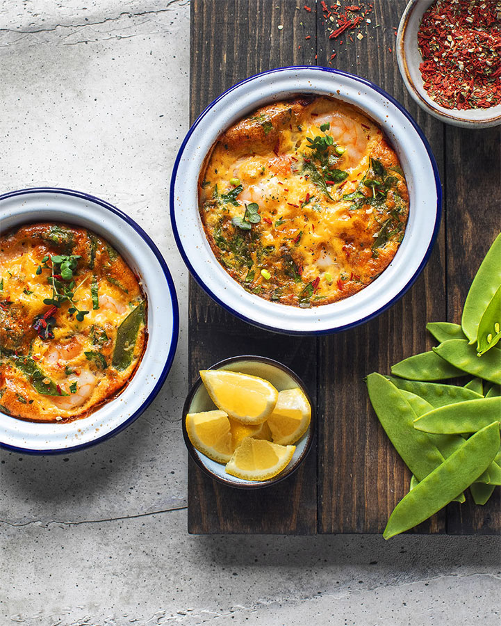 В глубокой миске с помощью миксера или венчика взбейте яйца и затем добавьте все ингредиенты: креветки, горошек, петрушку, цедру лимона, пармезан, соль, перец и приправьте специей «Томаты & Чеснок».