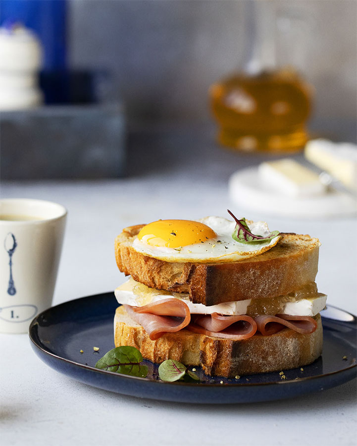 В центр каждого крепа выложите листья шпината, яичницу из одного яйца, ломтик ветчины и подверните края крепа в центр, формируя галету. Покрошите или положите в каждую креп-галету кусочек пикантного сыра Тет де Муан и наслаждайтесь вкусом истинно французского завтрака!