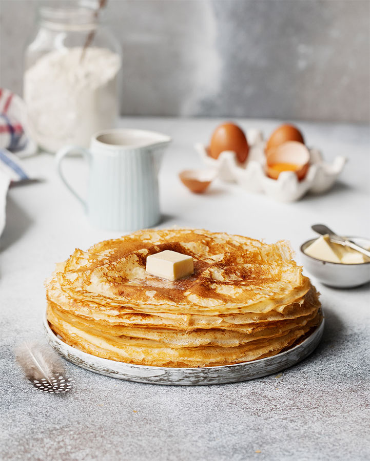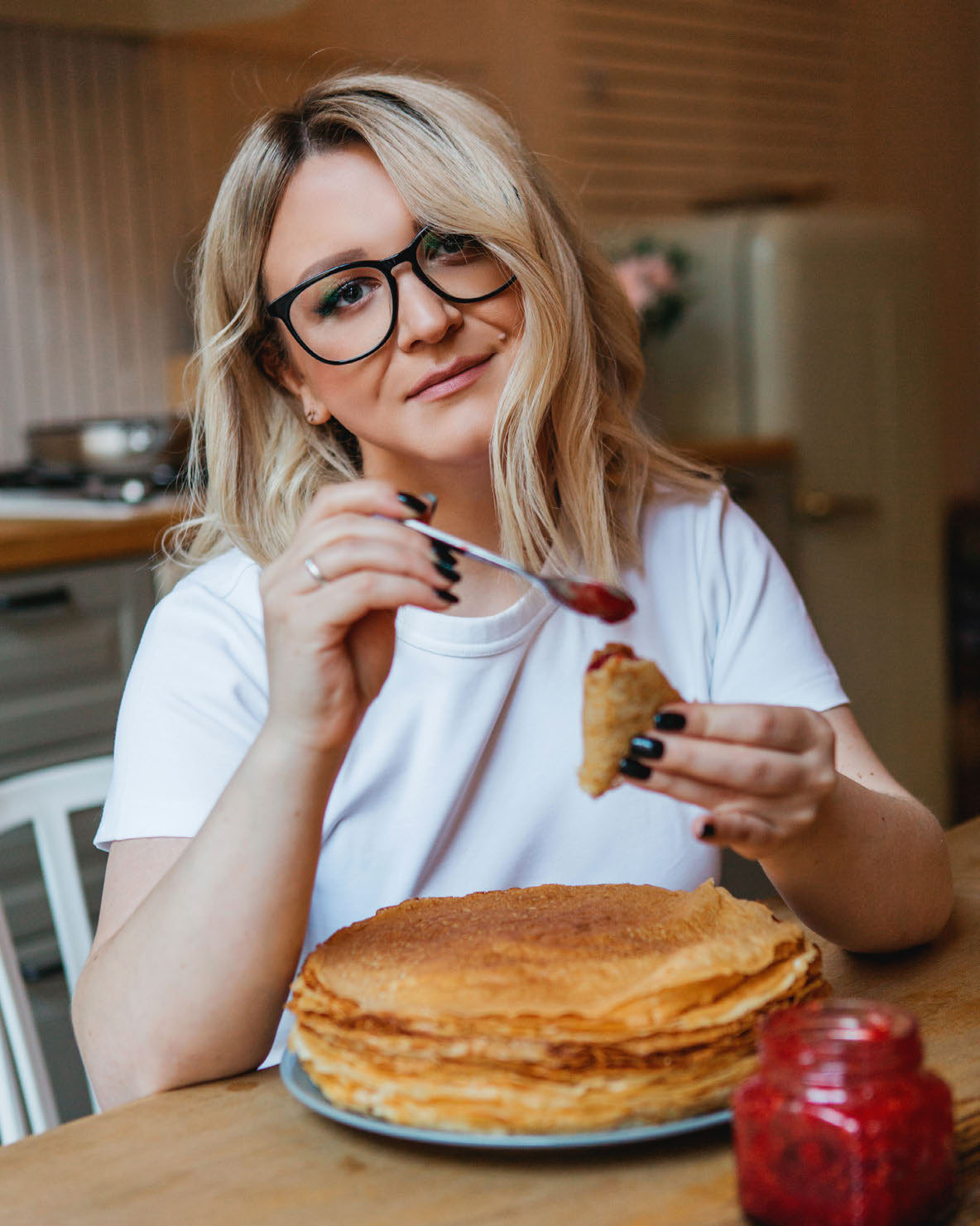 В сковороде с антипригарным покрытием растопите немного микса из сливочного и растительного масла. Когда масло зашипит, влейте на сковороду 3–4 ст. л. теста на один блинчик, чтобы получились блинчики диаметром 8 см. Жарьте блинчики 2–3 минуты с одной стороны до появления больших пузырьков, а затем еще 1–2 минуты с другой стороны. При необходимости добавляйте в сковороду сливочного и растительного масла. (Совет: чтобы блинчики оставались пышными, пока жарите все блинчики, поставьте тарелку с уже готовыми блинчиками в теплую духовку – 40 °С.)