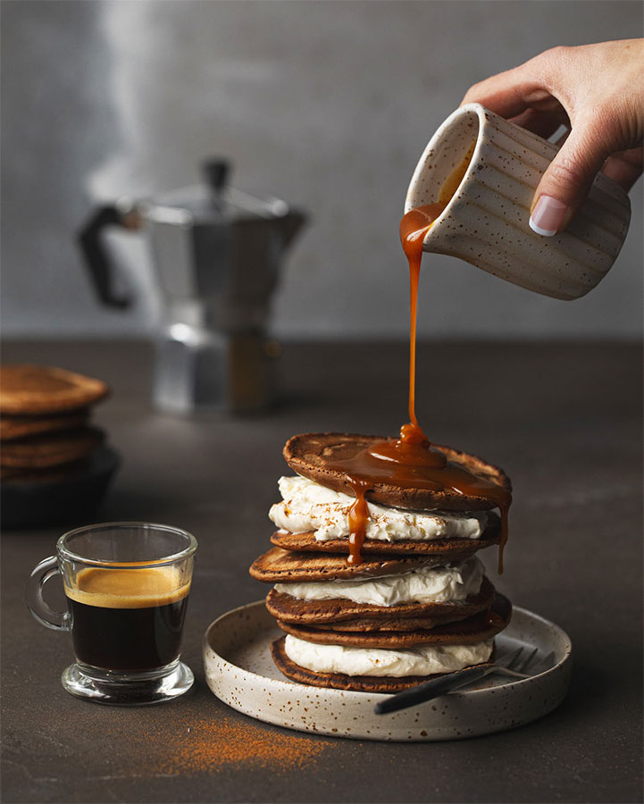 Столовую ложку готового крема выложите на один теплый блинчик и сверху накройте его вторым блинчиком. Посыпьте блинчики какао – и наслаждайтесь!