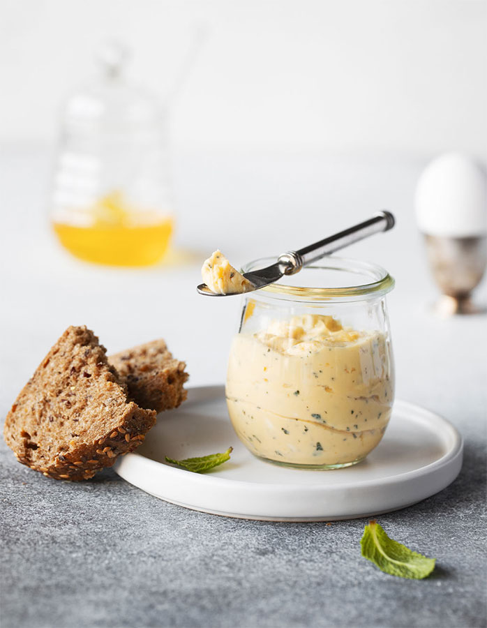 В сливочное масло комнатной температуры добавьте мед, лимонный сок, щепотку соли, желтки с мятой и все слегка перемешайте. Далее погружным блендером взбейте масло с желтками до однородной массы. Все. Готово.