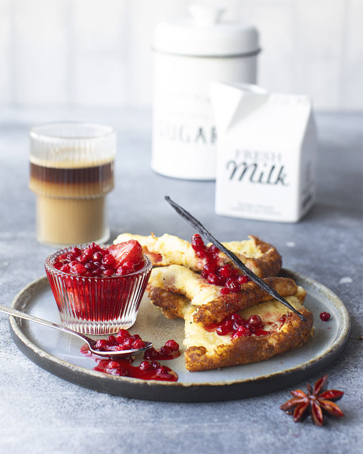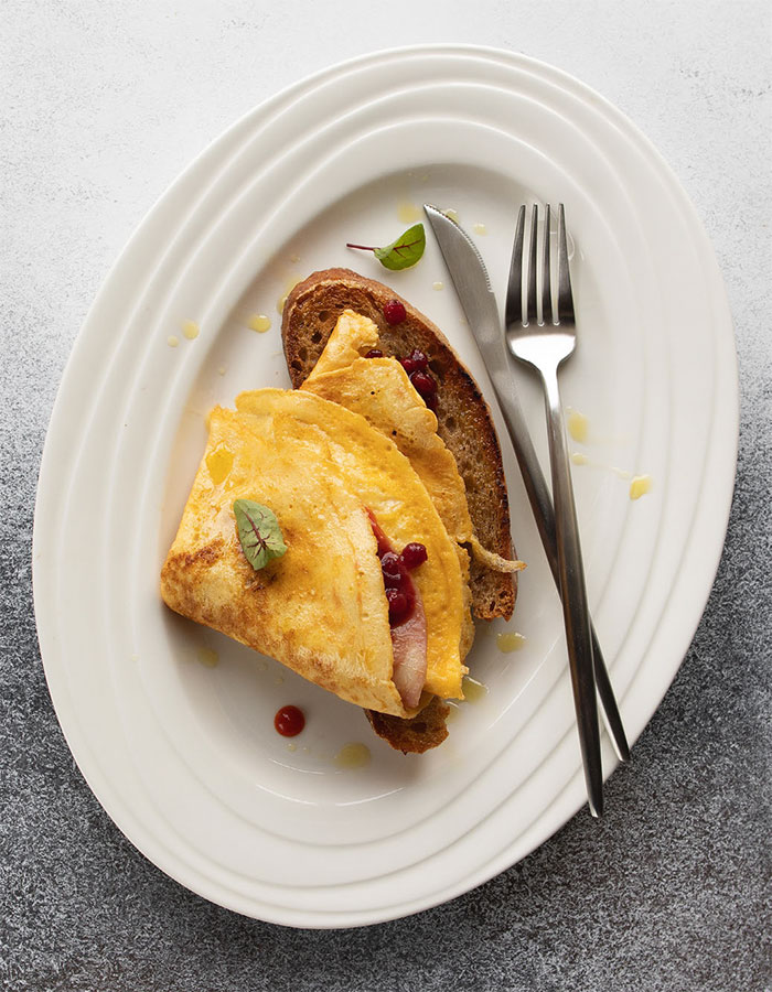 Прямо в сковороде с помощью лопатки сверните омлет конвертиком или как вы любите. Главное, чтобы ветчина и конфитюр оказались внутри.