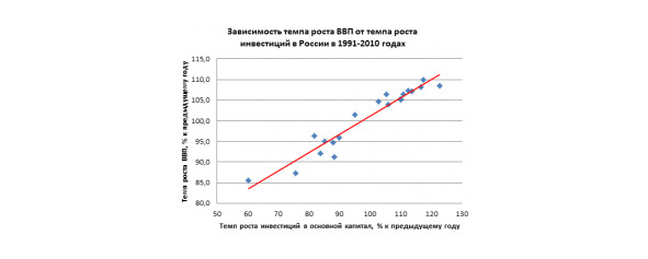 При темпе роста инвестиций равным Х=0, темп роста ВВП также будет равен 0. Даже если абсолютная величина инвестиций в основной капитал будет такой же большой, как и в предыдущем году. Или даже достигнет 25% ВВП РФ.