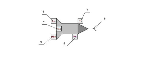 Принимать сигналы (импульсы) нейрон может с помощью входов. Каждый вход нейрона характеризуется весовым коэффициентом W (вес входа). Импульсы, поступая на вход нейрона, изменяют его текущее состояние. Эффект от импульса определяется типом входа, на который он поступил, весом этого входа а также текущим состоянием нейрона. На рисунке 12 представлена визуальная модель бионического нейрона и показаны его входы и выходы:1 – вход возбуждения, 2 – вход регуляции, 3 – вход памяти, 4 – вход запрета, 5 – вход торможения, 6 – выход (синапс) нейрона.