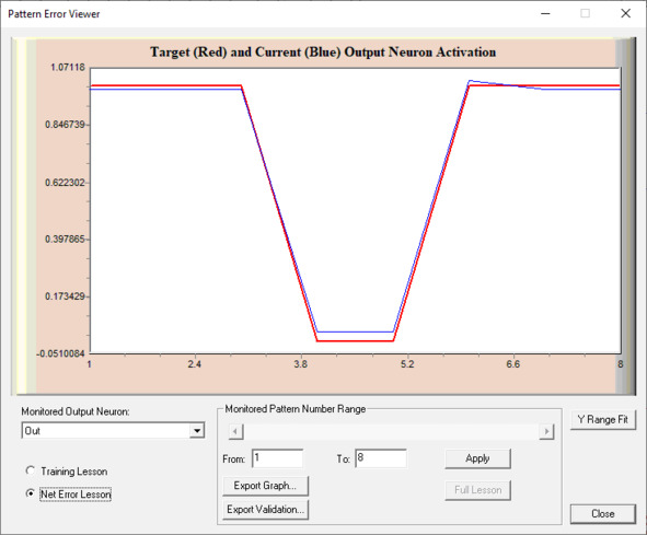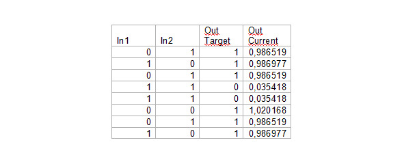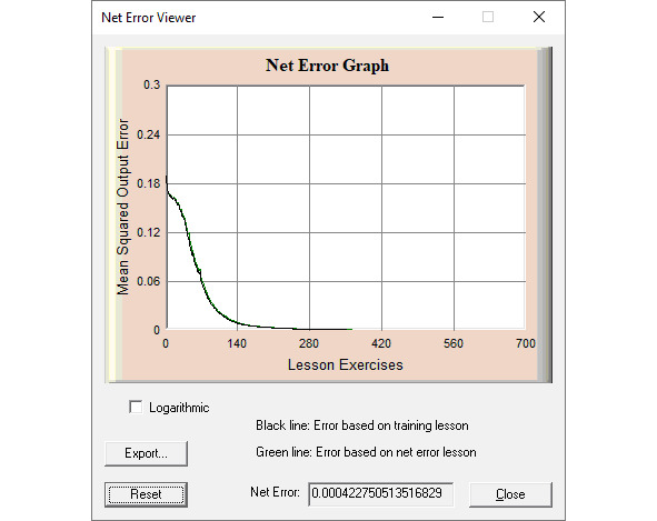 Обучение заняло около 300 эпох; была достигнута ошибка сети 0,0004
