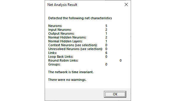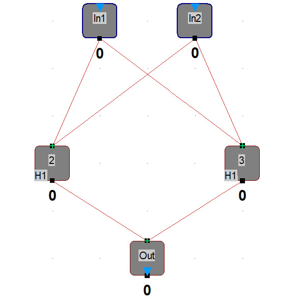 Из анализа видно, что всего нейронов 5, из них 2 – входных, 1 выходной, 2 скрытых нейрона в одном промежуточном слое. Нейросеть имеет 6 связей.