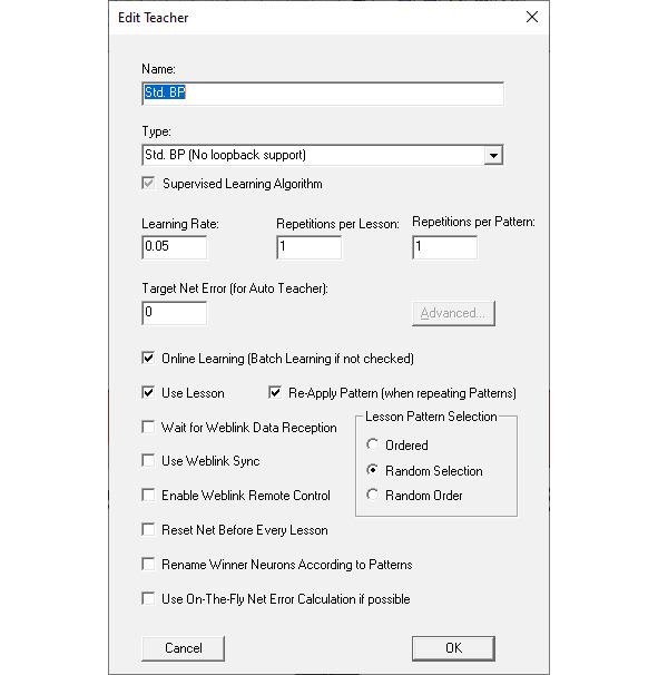 Блокируем нейроны (защищаем их от возможности переобучения) – выделяем все скрытые и все выходные нейроны, на одном из выделенных нейронов открываем Properties в открытом правой кнопкой мыши меню, активируем «Lock Act. Thres. For Teacher»: