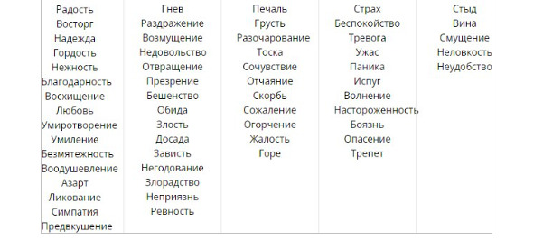 Эмоции могут быть объединены в пять тематических групп.