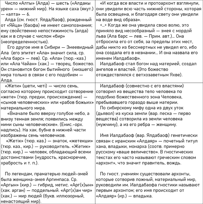 В сибирских мифах этот Змей также занял высокое положение в иерархии богов. Подобно гностическому Иалдабаофу, он принял участие в создании Вселенной, заняв срединное положение между верхним и нижним мирами. По этой причине тюрки его называли Ала (хак. «Ала Чайан» – творец, божество) – Бог, а индийские арии именовали Валой – змеевидным демоном, стражем вселенских форм – солнечных коров. А ведь, по сути, они всего лишь «Нечто» – аватары, произошедшие от неописуемого божественного «Ничто».