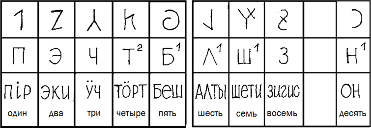 Рис. 3. Соответствия некоторых енисейских букв с названиями тюркских чисел