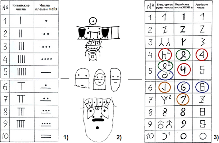 Если быть точнее, первоначальные написания индийских и арабских чисел сопоставимы с древнехакасскими буквами, которые формировались в кругах памятников эпохи бронзы в предгорьях северного Саяно-Алтая. Но этот предмет потребует больших разъяснений, чтобы быть рассмотренным в этой главе. Мы только укажем их структурные соответствия в виде таблиц. Ниже мы иллюстрируем детализации этих величин – чисел.