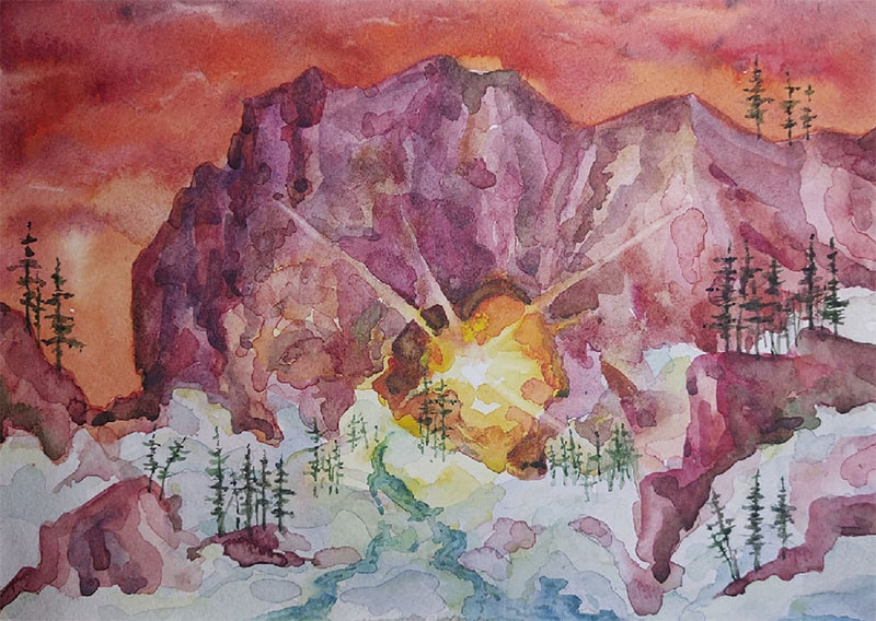 По мифам «Ригведы», солнечные коровы (лучи света) удерживаются в скале Вала (совр. горы Алатау) (рисунок автора).