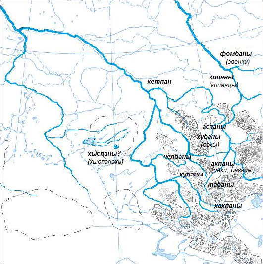 Пожалуй, самое важное наблюдение – это то, что множество этнонимов с названием «пан» (на территории Хакасии и в бассейнах рек Мрассу и Томь) находятся именно в указанных местностях.