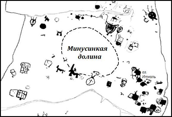 Карта-схема № 13. Территория Минусинской долины (tala – долина) с изображением ее ладонью (tala – ладонь) на загнутой руке (роге).