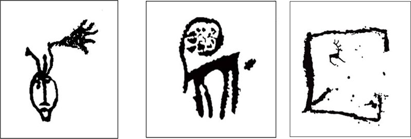 Ниже мы приводим три петроглифических рисунка из Саяно-Алтая, которые следует понимать как связанные по смыслу с личиной «Устье», где ее правый рог имеет вид загнутой руки (рога) с ладонью.
