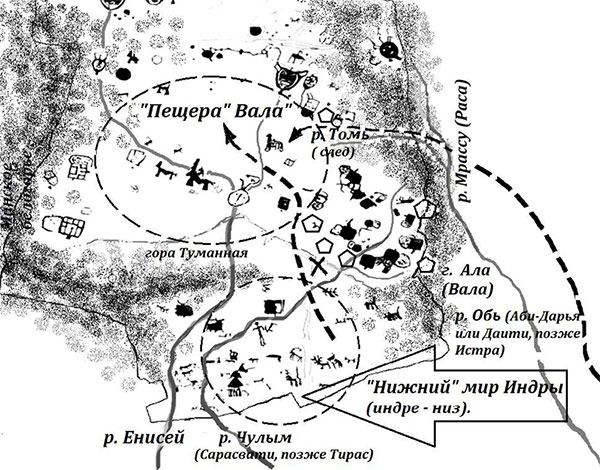 Главными загадками ведийской географии являются река Раса и пещерная гора Вала, т. е. важные географические ориентиры при определении андроновских ариев и земель «демонского» племени пани. Принимая за восточный конец земли кочевников – андроновских степняков долину реки Чулым, мы получим следующие результаты.
