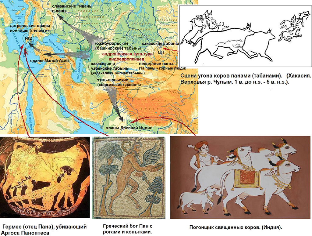 Мы не раз будем сопоставлять славянских панов, приуральских (башкирских) табанов, дуванов, табынов, тянь-шаньских давань (по Чжан Цяню), киргизских табындыр (табандыр), казахских и узбекских табынов с более древними табанами из глубин Саяно-Алтая (с хакасским родом). Автором этого труда насчитано около десяти племенных групп с основой этнонима на «пан» только на Саяно-Алтае (большей частью тюркоязычных в Хакасии и Кемеровской области). В историческом пространстве они сохранились как враги индоевропейских племен, как «демонское» племя пани, удерживающее коров ариев в пещере Вале (см. выше).