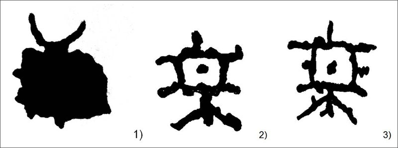 Рис. 9. «Лучи света» в петроглифах Древней Хакасии: солнечные коровы 1), 2) и небесная лось 3).