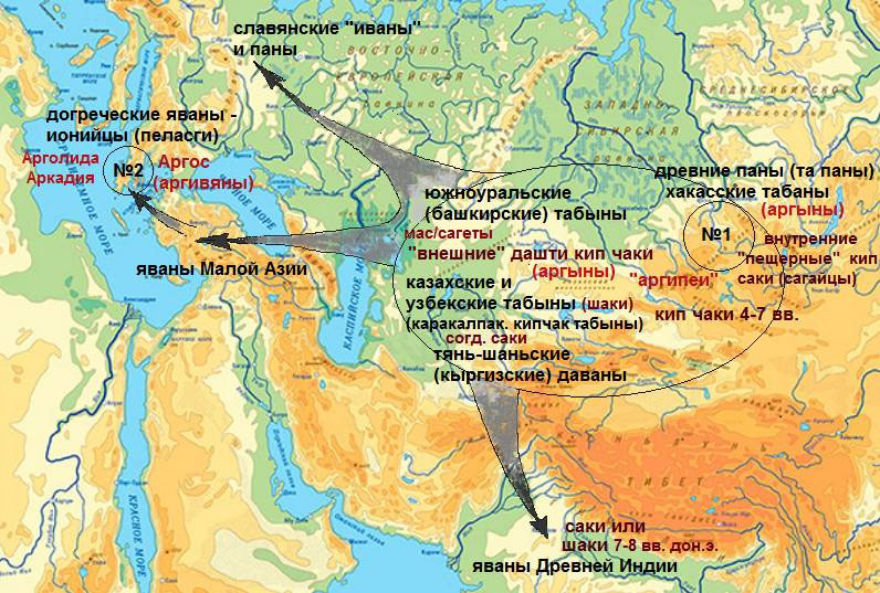 Кружком № 1 показана археологическая область окуневской культуры (II тыс. до н. э.) народа пан (табан) на северных отрогах Саяно-Алтая. В фольклоре хакасов эта земля сохранилась как Мöнi чир или Кöг Мен (Небесный Мен). Под кружком № 2 изображена горная область Мани, где располагался Пелопоннес ионийцев (яванов) – пеласгов, прибывших в Грецию из Малой Азии. Кстати, на западном побережье полуострова Малая Азия (XII век до н. э.) находилась область Иония (Явания).