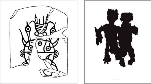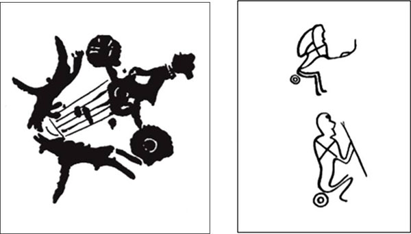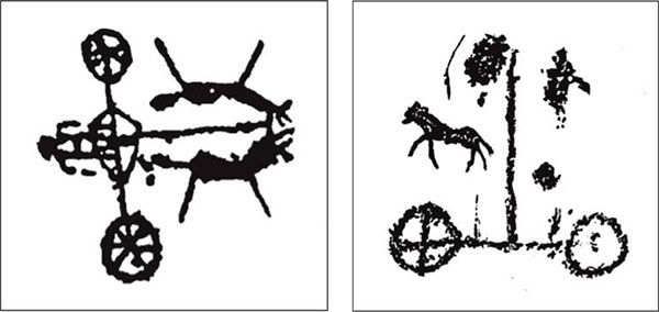 Рис. 60. Окутанная солнцем или подобная солнечным лучам колесница (слева, Хакасия) и Ашвины – братья-близнецы (справа, Калбак-Таш, Алтай).