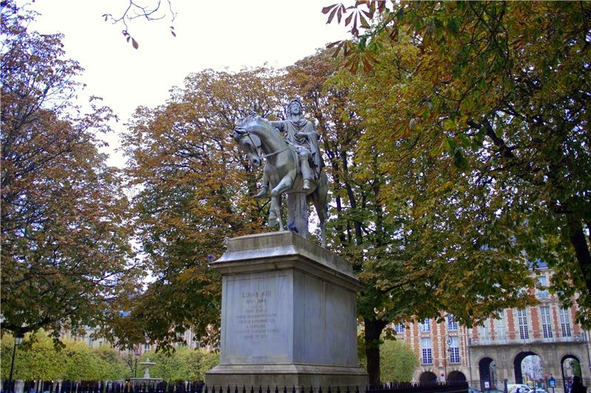 Она повернула голову вправо. Я проследил за ее взглядом и увидел в центре площади Вагезов известную статую Людовика Тринадцатого, восседавшего на коне.