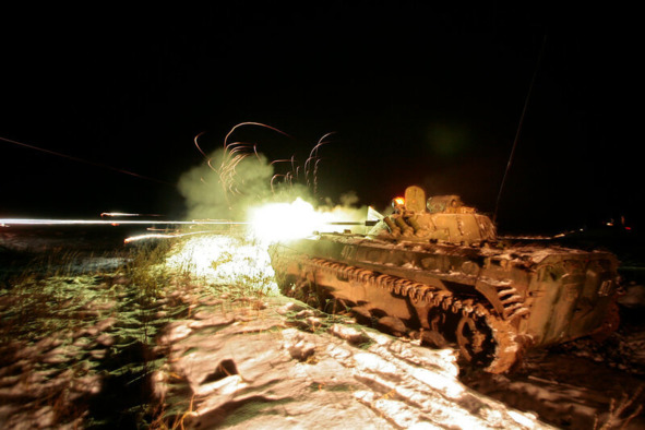 Терентьев взял снаряд и стал искать пушку. Да вот же она, прямо перед тобой! Он инстинктивно открыл на ней затвор и послал снаряд в ствол. Затвор тотчас автоматически захлопнулся. Ура! Можно стрелять! Терентьев стал искать цель в прибор ночного видения, но никак ее не находил. Прошло несколько минут, а цели все не было. Наконец, водитель механик внизу крикнул Терентьеву: «Едем!» А куда он едет – не сообщил. Машина взревела мотором и медленно поползла назад. И тут в оптике у Терентьева обозначилось нечто похожее на цель.