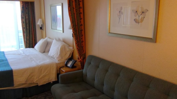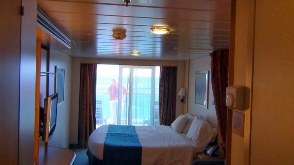 Так незаметно прошло время, наступил час дня и уже можно направится в нашу каюту. В реальности она оказалась лучше, чем я представлял по фотографиям в интернете. Сама по себе большая, немаленький балкон, широченная кровать, диван, столик перед ним.
