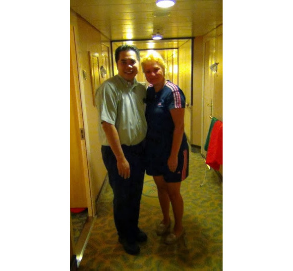 Мы приняли душ и легли немного подремать. Все таки сказывалась усталость после подъема в Москве в 3 ночи, и тревожного сна в Барселоне. Спустя час в дверь тихонько постучали. Стюард. Он представился, сказал, что будет нас обслуживать. Славный малый с Филиппин, очень приветливый, веселый. Свою работу делает на отлично, на все сто. Зовут его Ронольфо Руфано. В один из последних дней круиза жена сфотографировалась с ним на память.