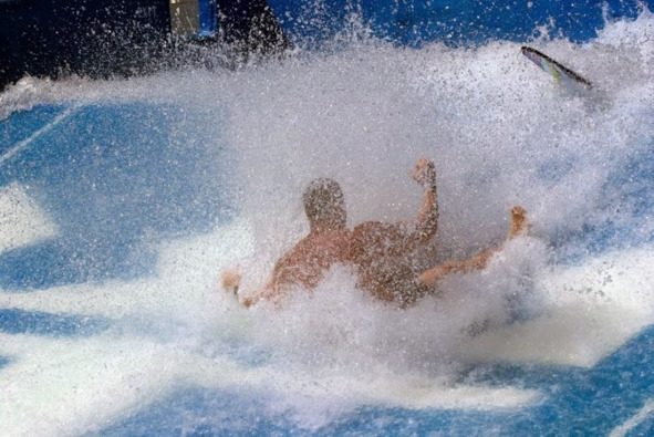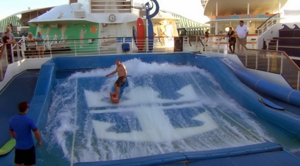 Так, постепенно, мы дошли до кормы судна. А там – настоящее веселье! Сооружение под названием flowrider, флоурайдер по-нашему, искусственная волна для серфингистов.
