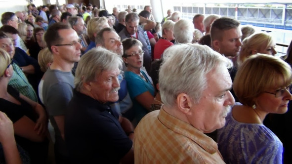 Всех пассажиров собирали на 4-й палубе. Спасательные жилеты надевать не скомандовали, а то я видел немало фотографий, где народ с ними превращали в одно оранжевое стадо. В общем, в случае чего бежать в этот сектор и сигать в лодку №30. Я в английском знаю всего с пару десятков слов, поэтому переводила жена, которая в школе учила именно его. Людей фиксировали по корабельным карточкам, практически так же, когда выходишь на берег. А до этого сотрудники Роял Карибиен в белой форме вежливо, но твердо выпроваживали пассажиров из кают, баров, кафе, бассейнов, джакузи, саун и прочих мест дислокации. Народ на корабле собрался самый разношерстный. Но, большинству, конечно, где-то за 60. Всех построили в колонны и начали учения. Известно, что пассажиры не очень любят данную процедуру.