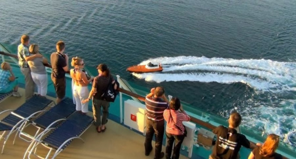 Лоцманский кораблик, сопровождавший круизное судно, разворачивается за кормой и отправляется домой.